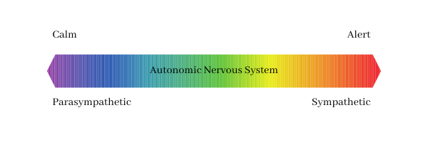It’s helpful to think about your nervous system as a pole between calmness on one end and alertness on the other. The autonomic nervous system is made up of two opposing systems called the sympathetic and parasympathetic. When the sympathetic nervous system is activated it moves us towards the alert end of the spectrum, and when the parasympathetic nervous system is activated it moves us towards calmness.