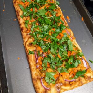 Top baked flatbread with fresh carrot, basil, and cilantro and serve with lime wedges.